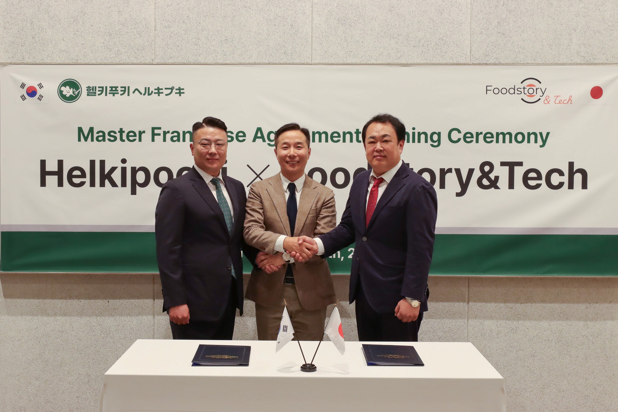 20일 오전 10시 일본 도쿄에서 마이프차가 헬스 푸드 전문 브랜드 헬키푸키와 푸드스토리앤테크 간 마스터프랜차이즈 계약을 성사했다. (왼쪽부터) 헬키푸키 문상돈 대표, 마이프차 김준용 대표, 푸드스토리앤테크 박경진 대표